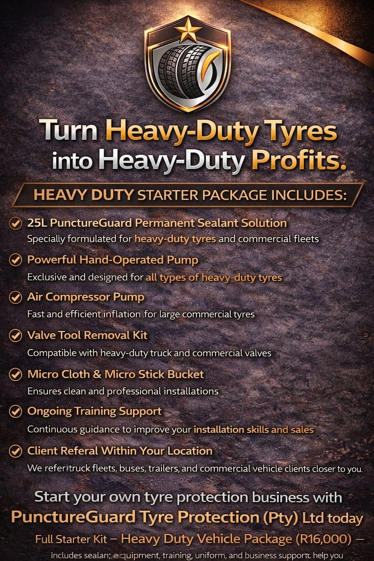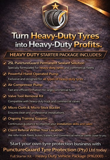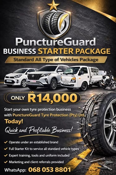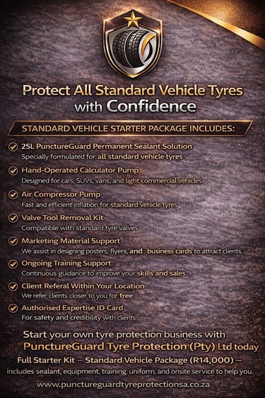 PunctureGuard Tyre Protection SA offers motivated entrepreneurs the opportunity to start their own tyre protection business using our proven permanent tyre sealant technology.